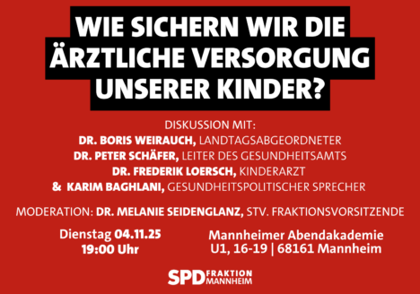 Die SPD im Mannheimer Gemeinderat lädt am 4. November um 19 Uhr herzlich in die Mannheimer Abendakademie (U1, 16-19) zu einer Podiumsdiskussion über die Fragestellung „Wie sichern wir die ärztliche Versorgung unserer Kinder“ ein. Laut dem aktuellen Versorgungsbericht der Kassenärztlichen Vereinigung gilt Mannheim kinderärztlich als überversorgt. Tatsächlich gibt es aber erhebliche Unterschiede zwischen den Stadtbezirken. Während in…