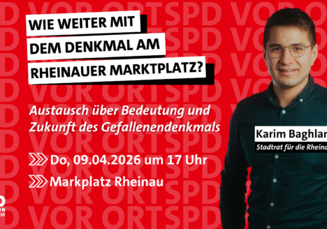 Im Zuge der Neugestaltung des Rheinauer Marktplatzes stand auch das Gefallenendenkmal im Fokus der öffentlichen Diskussion. Die Bürgerschaft äußerte mehrheitlich den Wunsch, dass es als Erinnerung an die Vergangenheit Rheinaus dort verbleibt. Seit der Einweihung des Platzes ist das sanierungsbedürftige Denkmal weiter eingehaust. Die SPD-Gemeinderatsfraktion lädt daher zu einem Vor-Ort-Termin auf den Rheinauer Marktplatz ein,…